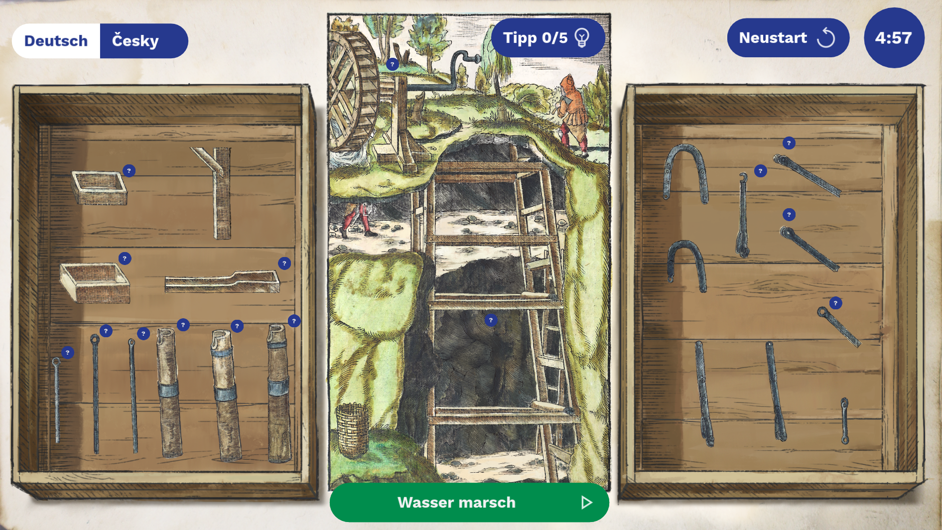 Zuvor musst du aber alle Teile der Pumpe richtig zusammensetzen. Beeile dich, sonst läuft der Grubenschacht mit Wasser voll!